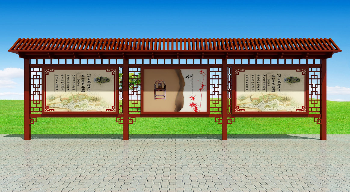 戶外仿古展示欄比較具有中國傳統文化風格。仿古的設計,能將更多元素融入其中,更好的將自然文化和古文化結合在一起,為了讓宣傳欄更具有代表性,在不同的場景要有不同的設計。